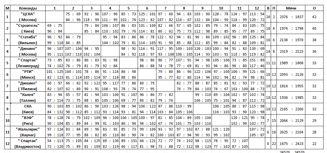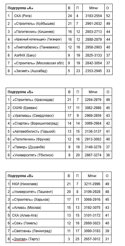 «Статиба» – 10 побед (рижский тур 6-0), ЦСКА – 10 (5-1), «Динамо» М – 8 (4–1, игра с «Калевом» перенесена), «Строитель» – 7 (4-2), «Спартак» Л – 5-6 (3-3), СКА К – 5-6 (3-3), «Динамо» Тб – 5-6 (2-4), «Калев» – 4-6 (2-3, игра с московским «Динамо» перенесена), «Жальгирис» – 4-7 (3-3), ВЭФ – 4-7 (2-4), РТИ – 3-8 (1-5), «Спартак» Вл – 0-11 (0-6).