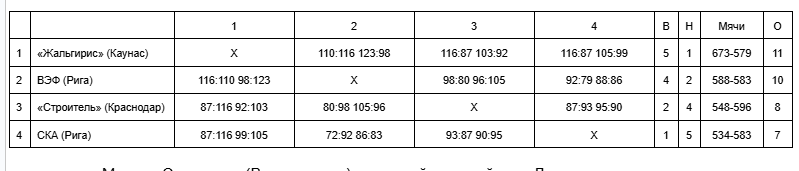 Конечно, были ожидания, что на своей площадке в Вильнюсе сенсационная «Статиба» продолжит восхождение. Однако вышло все наоборот – состоялся двойной реванш. Сначала аутсайдер «Жальгирис» (травмы лидеров Йовайши и Линкявичуса не могли не сказаться на игре команды) победил в литовском дерби – 88:82, а затем ЦСКА вернул должок обидчику – 118:99. На третий день московские динамовцы, у которых по-прежнему было лишь два поражения, могли совсем усложнить жизнь «Статибе», но в овертайме хозяева были удачливее – 104:102. «Динамо» же после дня отдыха проиграло ЦСКА – 95:111, а через неделю в Таллине – и перенесенный матч «Калеву» – 100:103.