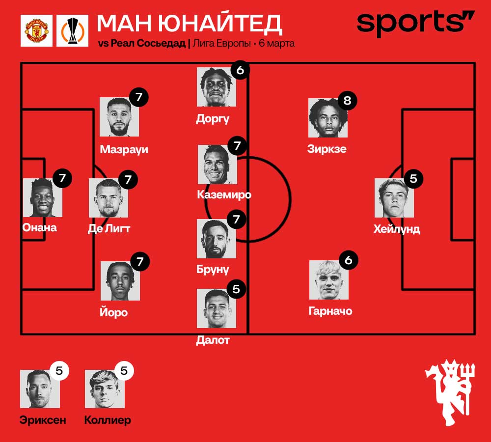 Бруну Фернандеш (7) – эпизодически блистал из-за двух аспектов игры. 1. В матче порой возникал хаос, который португалец обожает. Отдал несколько острых передач и сам подключился в штрафную с ударом. 2. Когда «Юнайтед» сел ниже, Бруну отлично заправлял дальние мячи из глубины: несколько раз отправил по флангу Далота, Гарначо и Хейлунда. Не повезло в моменте с пенальти: руки были в естественном положении – во время прыжка они всегда в этом месте.