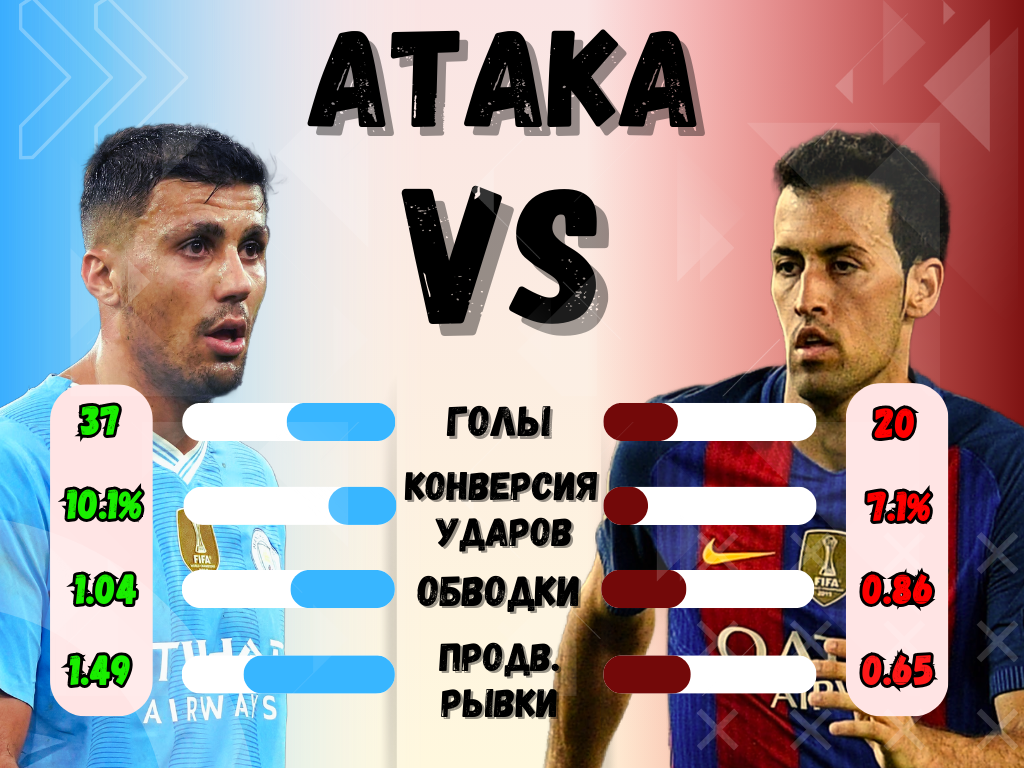 Тем не менее, в других характеристиках Родри антропометрия не помогает. Не сказать, что Родри легко обвести: лишь в 29% случаев его обходят. Однако Бускетс имеет какие-то космические цифры. Только 11% попыток обводок оказываются успешными. Опять же убеждаемся его безупречным чтением игры. К тому же, он и фолит меньше Родри (1.2 против 1.55), и теряет мяч (1.28 – 1.39).
