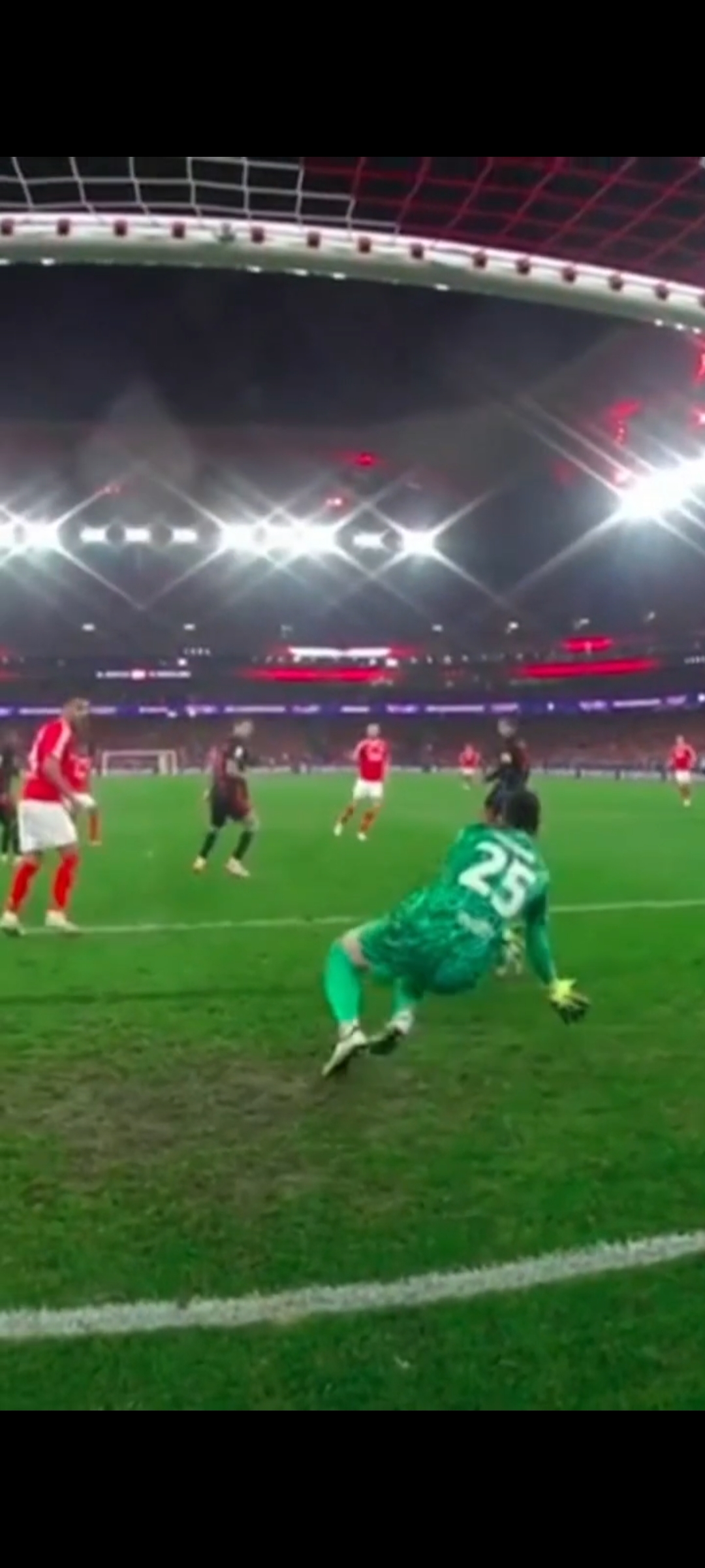 А в этой ситуции, наоборот, выбить мяч своему уже не получалось, так что максимально неудобный мяч с отскоком от газона пришлось забирать. К сожалению не нашел крупного плана, но на нем было видно, что мяч пришлось ловить запястьями, но Алиссону в тот вечер было подвластно даже такое.