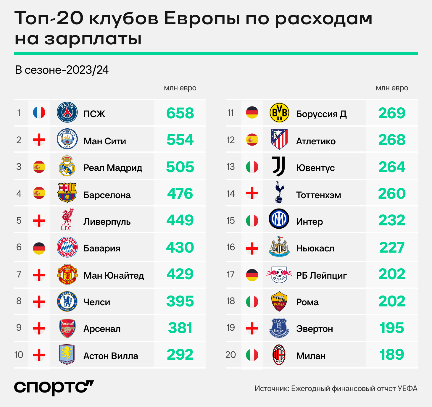 🇫🇷 Больше всех в Европе платит «ПСЖ» – 658 млн евро. Отрыв от идущего вторым «Ман Сити» – больше ста миллионов. Важное уточнение: данные за сезон-2023/24 – с тех пор «Париж» уже отпустил Килиана Мбаппе, который был самым высокооплачиваемым футболистом в Европе. Так что в следующем году «ПСЖ» может уступить первое место в рейтинге.