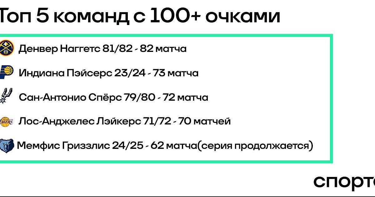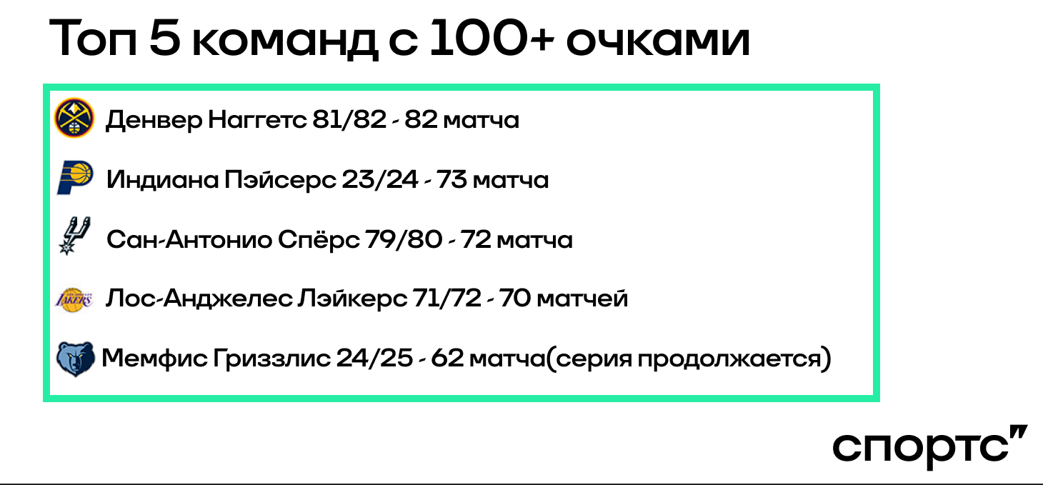 Мемфис Гриззлис забили 103 очка в последнем матче с Оклахомой, эта встреча стала 62 подряд в которой Гриззлис пробили 100+ очков, тем самым они стали 5 командой в истории с данным достижением: