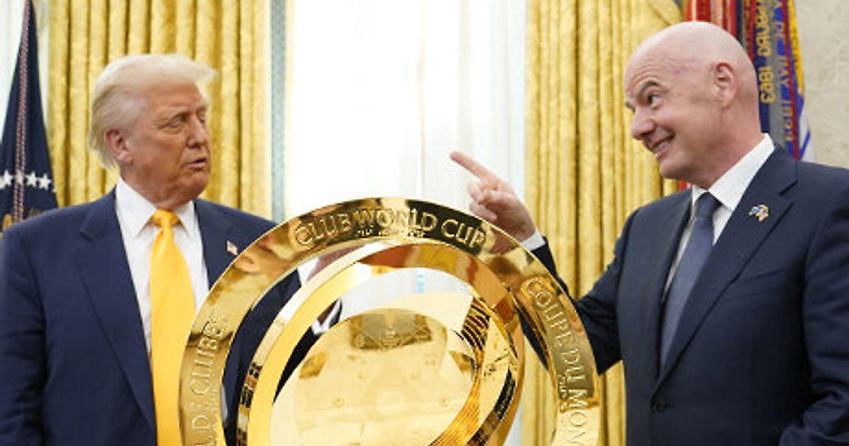 Не забыли и про клубный ЧМ, который стартует уже этим летом. Инфантино представил президенту США трофей клубного ЧМ от Tiffany: тот самый, где дважды упоминается сам Инфантино и на котором есть его подпись.