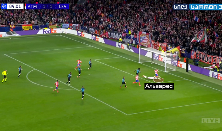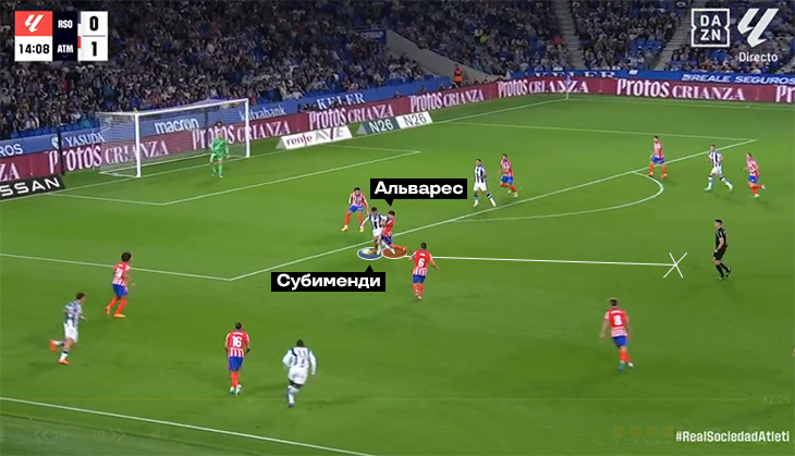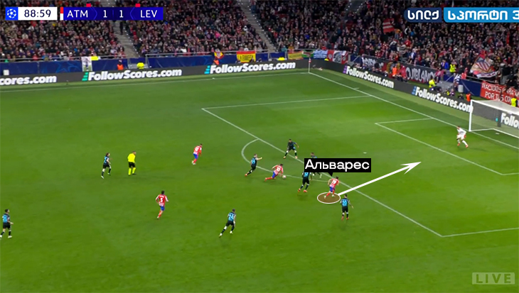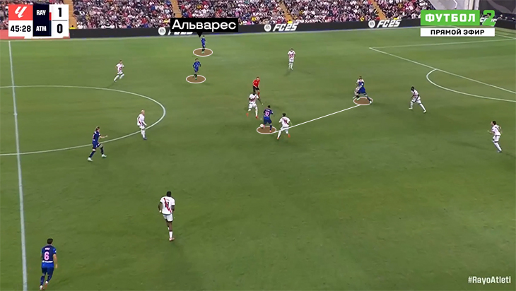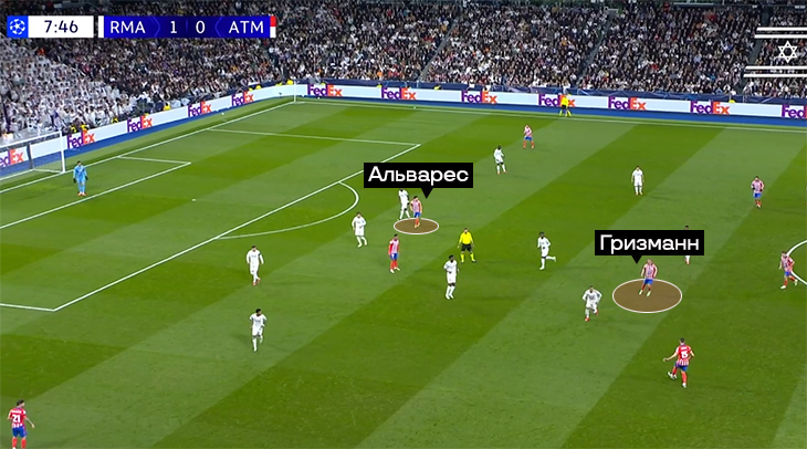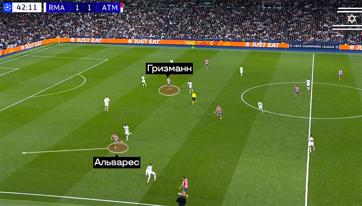 А пока Альварес и Гризманн играют вместе и помогают друг другу, постоянно меняются местами. Альварес двигается в зависимости от легенды. Пример из игры с «Реалом» в ЛЧ: когда принц отходит назад за мячом, аргентинец становится чуть ли не наконечником.