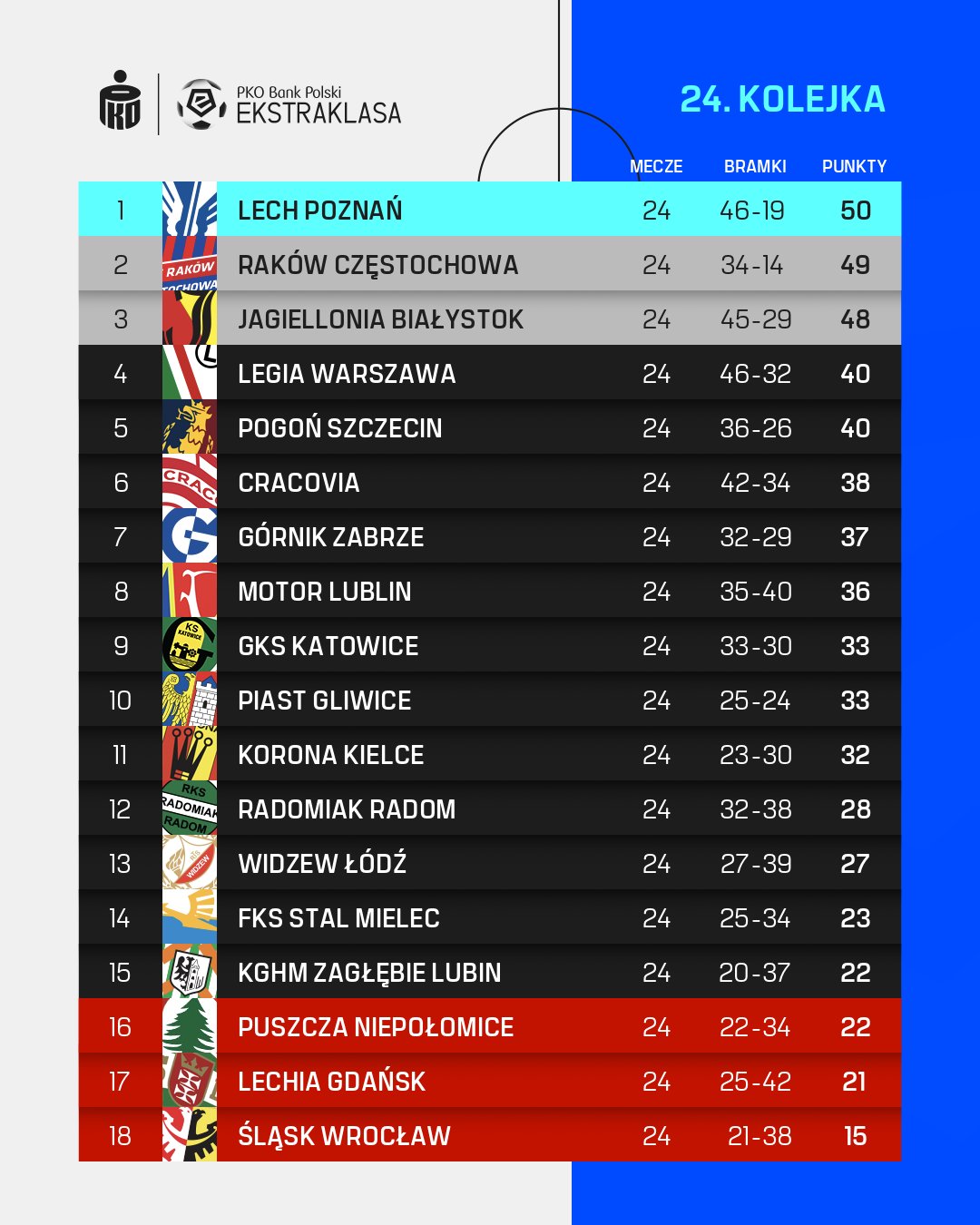 В турнирной таблице за 2025-ый год лидером Экстракласы является «Корона». В 24-ом туре подопечные Яцека Зелиньского набрали очередные три очка, переиграв дома «Пущу». Удалось это сделать даже несмотря на то, что «зубрам» удалось открыть счет – Крачун реализовал пенальти.