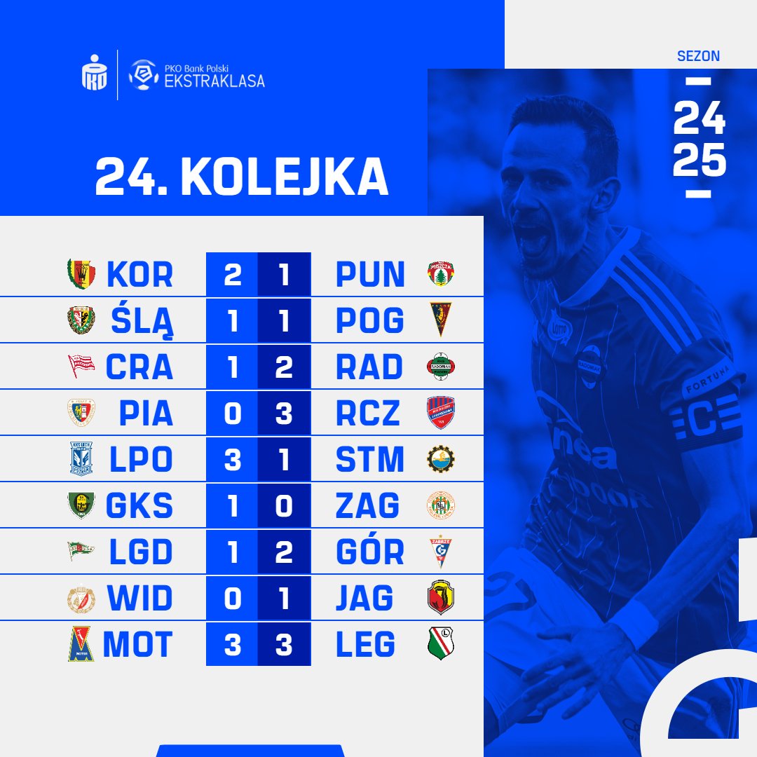24-й тур подарил триллер в Люблине в исполнении «Мотора» и «Легии», претендента на глупейший гол года, очередную тренерскую отставку и очередные победы лидеров чемпионата.