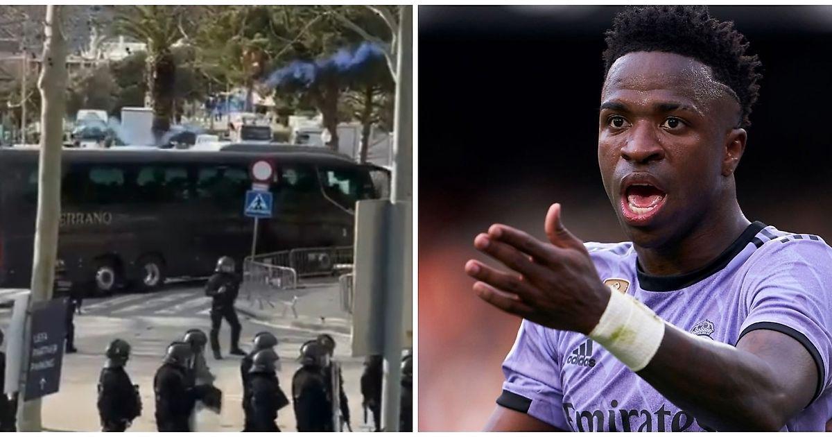 🎥 Фанаты «Барсы» сходят с ума перед матчем с «Бенфикой». Закидали автобус гостей, троллили Винисиуса 😡