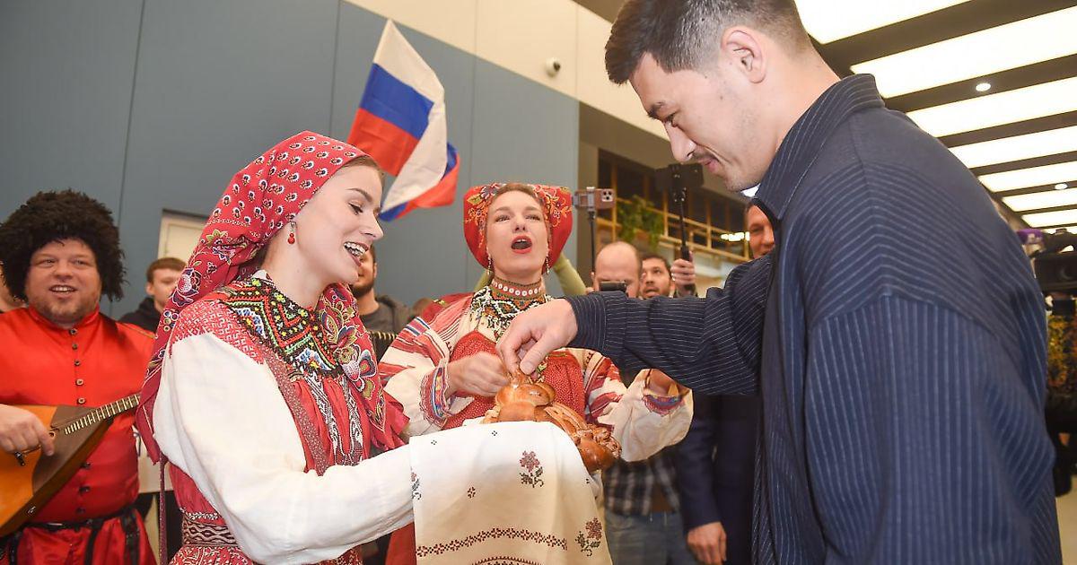 Дмитрия Бивола встретили дома под песню Виктора Цоя с караваем и российскими флагами. Чемпион вернулся в Москву