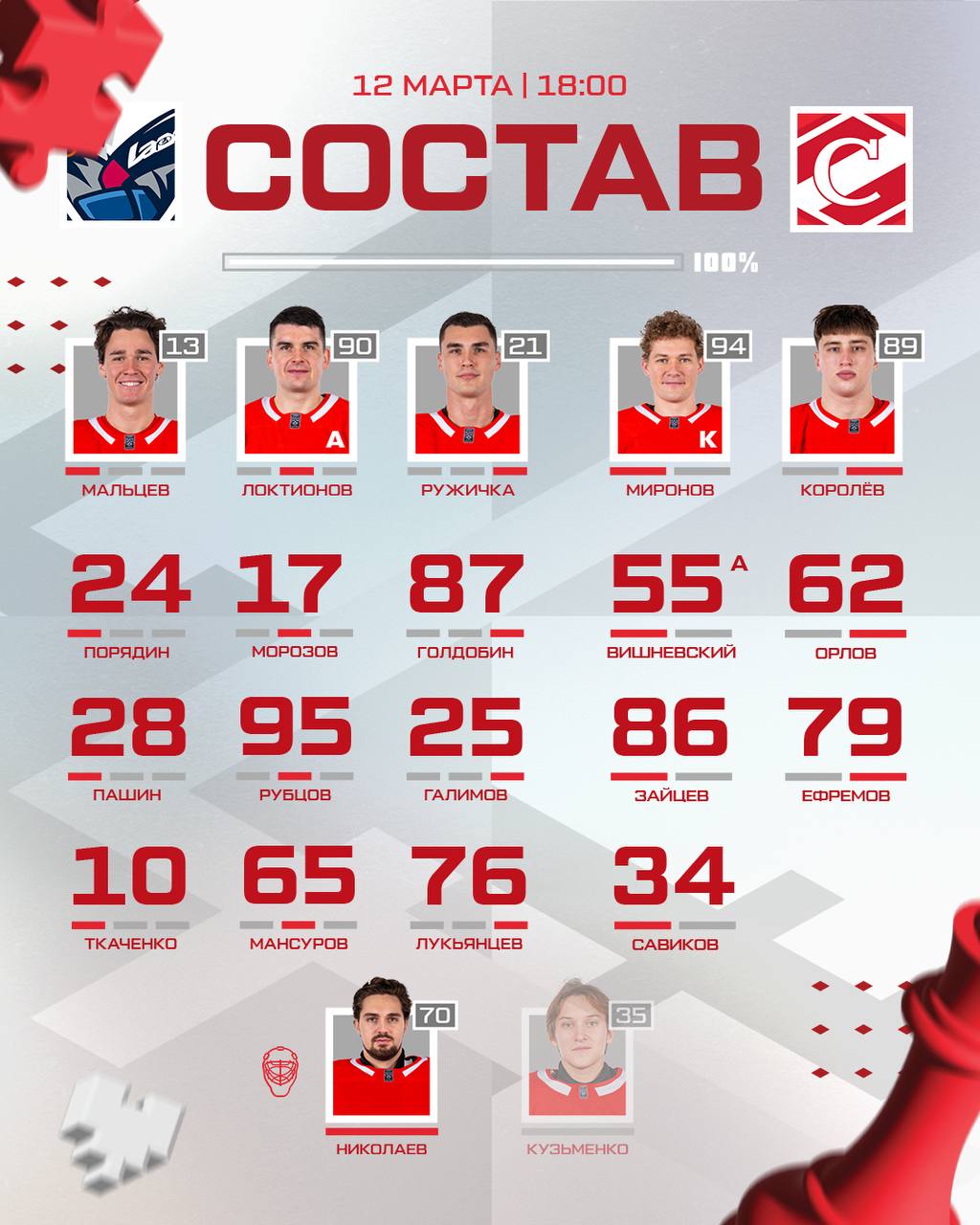 Состав спартаковцев на сегодняшний матч