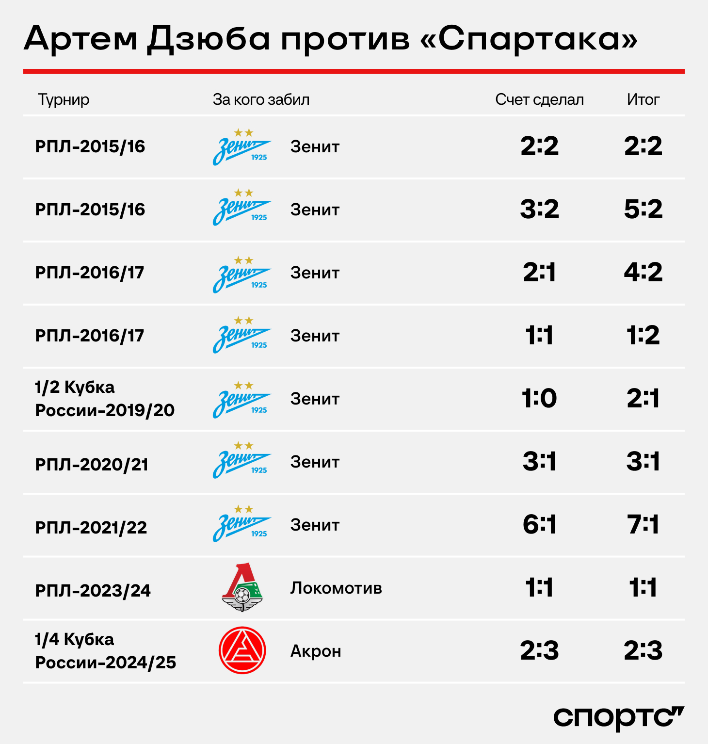 ● Дзюба особенно настраивается на матчи против родного клуба. «Наверное, «Спартак» уже не такой раздражитель, как раньше. Однако для меня это все равно принципиальный матч, потому что я все-таки воспитанник «Спартака». Мне нравится играть против них. Еще остались те ребята, которых я хорошо знаю, против которых интересно играть», – рассказал Артем в феврале 2023-го «Чемпионату».