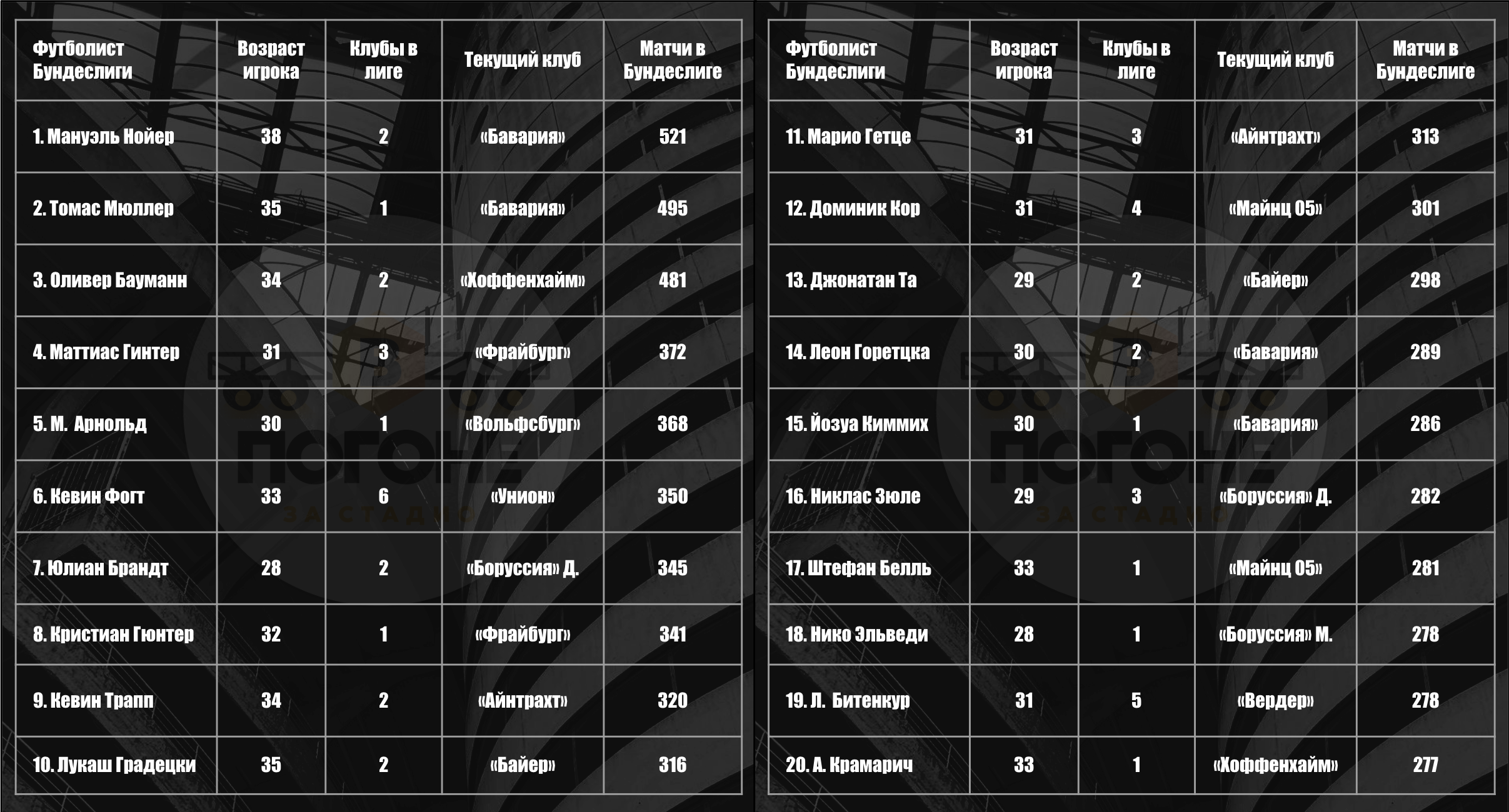 - Мануэль Нойер, вратарь, 38 лет: 554 матча, 262 «сухие» игры, 2 голевые передачи