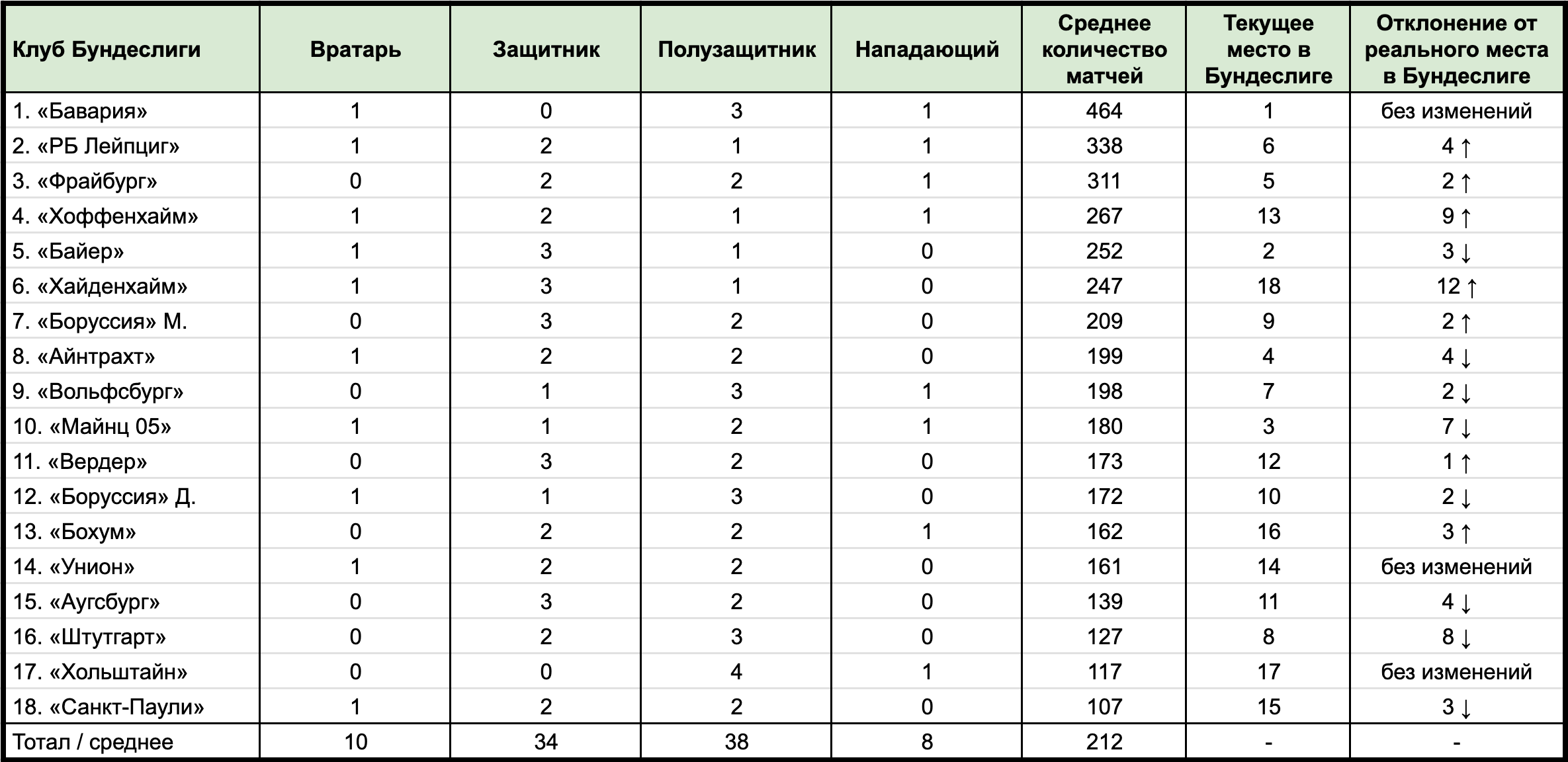 - В среднем по 18 клубам Бундеслиги вышло, что футболист проводит за клуб 212 матчей, то есть плюс/минус 4-5 сезонов в зависимости от того, играет клуб в еврокубках или нет. Практически столько же, сколько в Ла Лиге (217 матчей), чуть меньше, чем в АПЛ (224 матча) и значительно больше, чем в Серии А (155 матчей) и французской Лиги 1 (140 матчей).