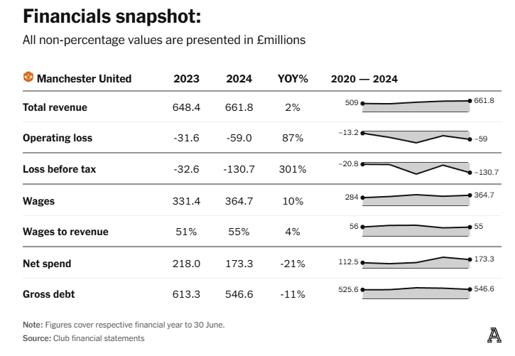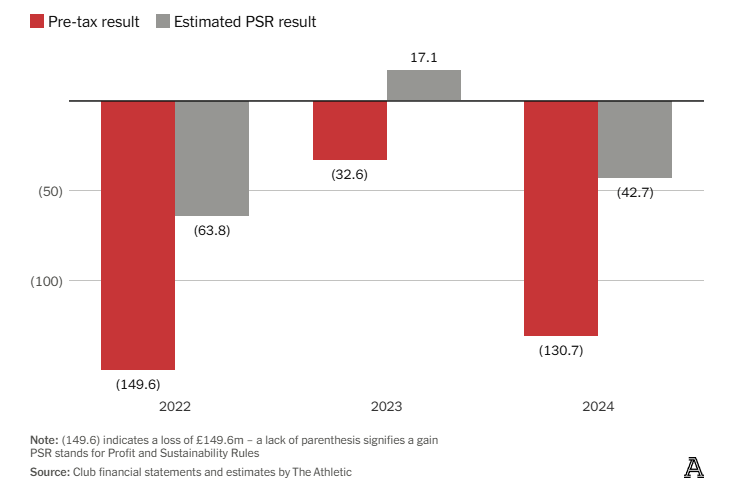 По оценкам The Athletic, убыток клуба в расчётах PSR за сезон 2023/24 составил около £43 млн. При текущем обменном курсе это оставляет клубу возможность понести лишь до £8 млн убытков в расчётах УЕФА, чтобы не превысить лимит в €60 млн. £35 млн расходов на приобретение акций в прошлом сезоне больше не будут учитываться в этом году, что позволяет клубу приблизиться вплотную к лимиту УЕФА — но становится очевидно, почему возникает беспокойство. В 2023 году «Юнайтед» уже нарушил прежние правила финансовой устойчивости УЕФА, предшествовавшие новому правилу «футбольных доходов», за что был оштрафован на €300 000.