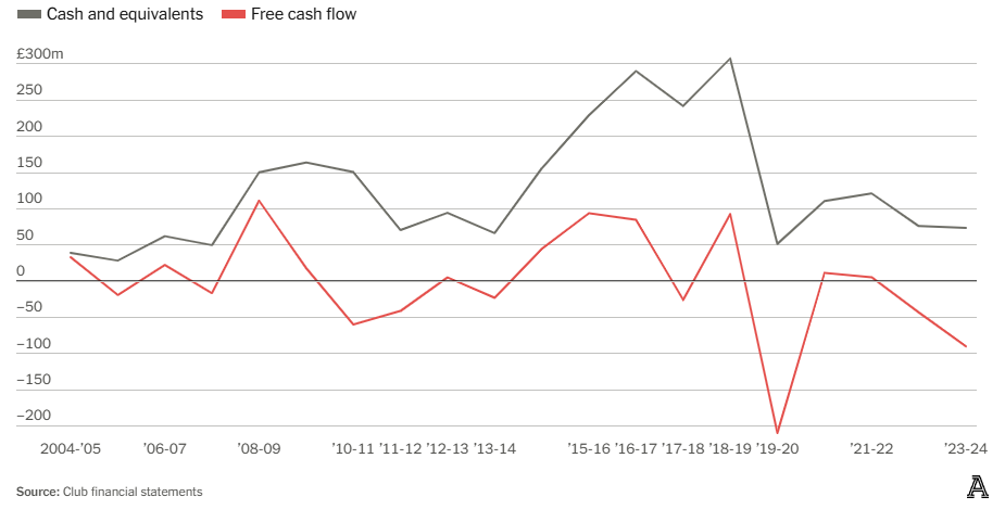 Существенной проблемой на «Олд Траффорд» долгое время оставалась простая вещь: нехватка «живых» денег. Манчестер Юнайтед всегда был клубом с высокой способностью генерировать денежные потоки, и, хотя они по-прежнему демонстрируют значительные операционные поступления (£121,1 млн в прошлом сезоне), траты на трансферы создают проблемы. Свободный денежный поток (FCF) клуба за последние годы резко сократился. FCF, по сути, — это сумма средств, остающаяся после капитальных расходов, которые для Юнайтед в основном связаны с трансферными выплатами.