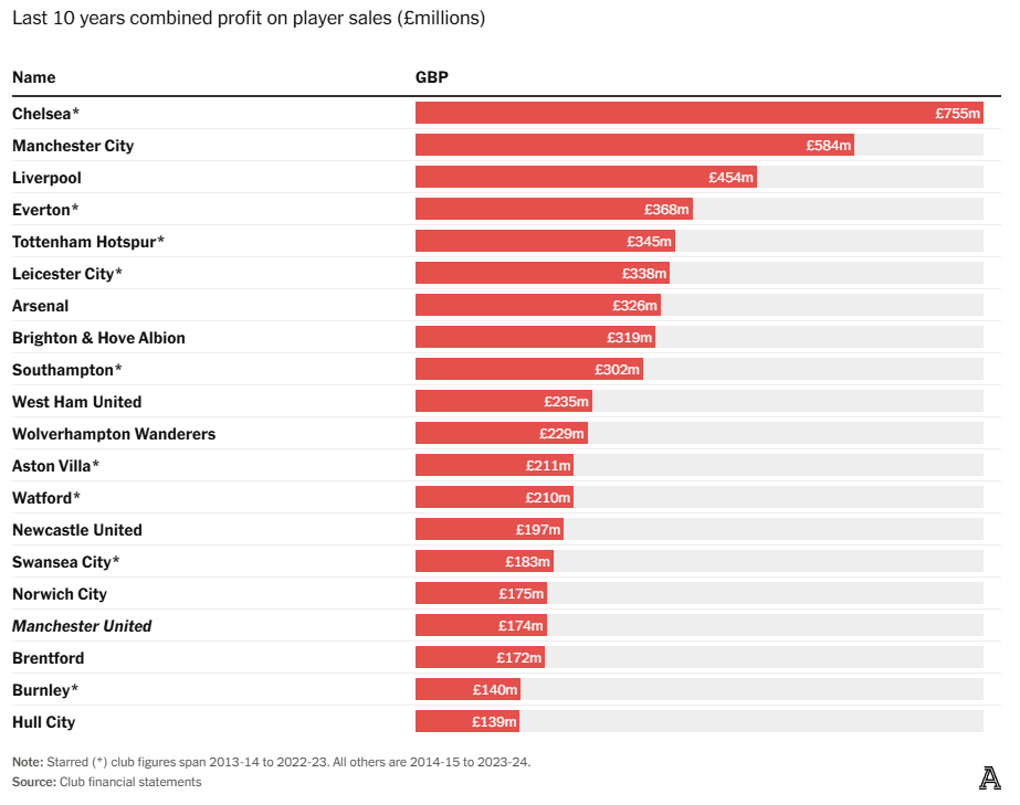 И даже после этого на конец декабря Манчестер Юнайтед продолжал задолжать другим клубам по трансферным платежам чистую сумму в £300,1 млн, из которых £167,9 млн подлежат выплате до конца 2025 года. За исключением Челси (который не раскрывает конкретную сумму кредиторской задолженности по трансферам, но значительные обязательства клуба указывают на крупные суммы, причитающиеся другим клубам), ни один другой клуб Премьер-лиги не имеет такой большой задолженности по трансферам.