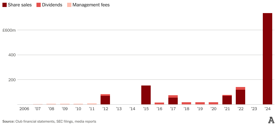 Сегодня долг «Юнайтед» на £180 млн больше, чем изначальные £550 млн, взятые в кредит для покупки клуба Глейзерами. Между тем сама семья Глейзеров за эти годы заработала £1,202 млрд на продаже акций. Если сложить эти суммы с дивидендами и управленческими выплатами, то можно подсчитать, что совокупная выгода семьи Глейзеров от владения «Манчестер Юнайтед» составила £1,358 млрд. И, несмотря на продажу части акций Рэтклиффу, они по-прежнему контролируют 67,92% голосов в клубе, который был оценен в £4,3 млрд в ходе сделки прошлого года.