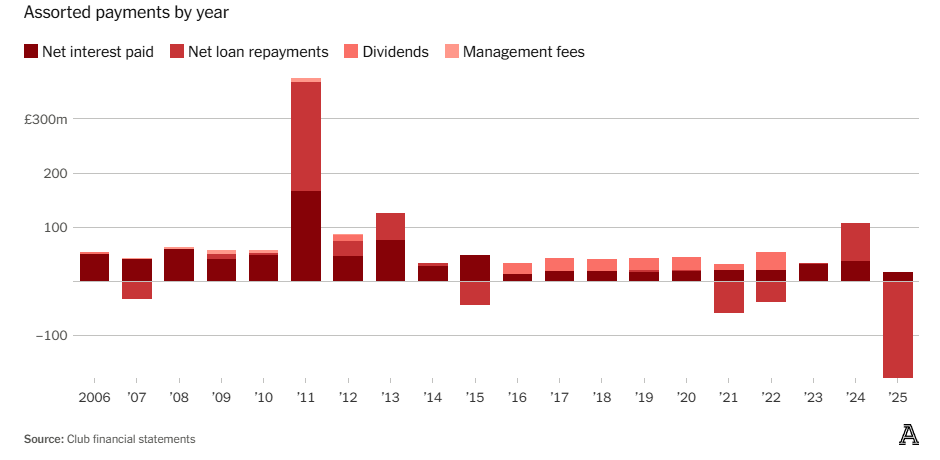 Этот уровень долга – вовсе не вина Рэтклиффа и INEOS. Сделка по продаже клуба Глейзерам в 2005 году по-прежнему оказывает одно из самых негативных долговременных последствий в истории футбола. По состоянию на конец декабря 2024 года 19,5 лет владения клубом обошлись «Юнайтед» в £835,0 млн только в виде процентных выплат по кредитам, £169,7 млн в виде дивидендов (£128,7 млн из них получили непосредственно Глейзеры), как минимум £27,4 млн на оплату управленческих и консультационных услуг, а также £24,6 млн на чистые выплаты по займам. И это без учета того, сколько из £148,6 млн, выплаченных директорам и ключевым управленцам за последние два десятилетия, в конечном итоге оказалось у Глейзеров.
