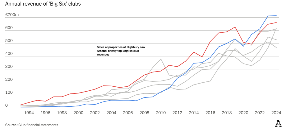 Выручка Манчестер Юнайтед достигла клубного рекорда в прошлом сезоне и составила £661,8 млн, что на £13,4 млн или 2% больше, чем годом ранее. Это могло бы звучать неплохо само по себе, но последние годы показывают, что способность Юнайтед к генерации доходов уже не так почитаема, как раньше. С 1996 по 2004 годы Манчестер Юнайтед был клубом с наибольшими доходами в мировом футболе. В течение 28 сезонов после создания Премьер-лиги — с 1992 по 2020 годы — Юнайтед оставался самым доходным клубом Англии; исключением стали лишь два года, 2009 и 2010, когда лидерство перехватил Арсенал благодаря доходам от продажи собственности на месте бывшего стадиона Хайбери.