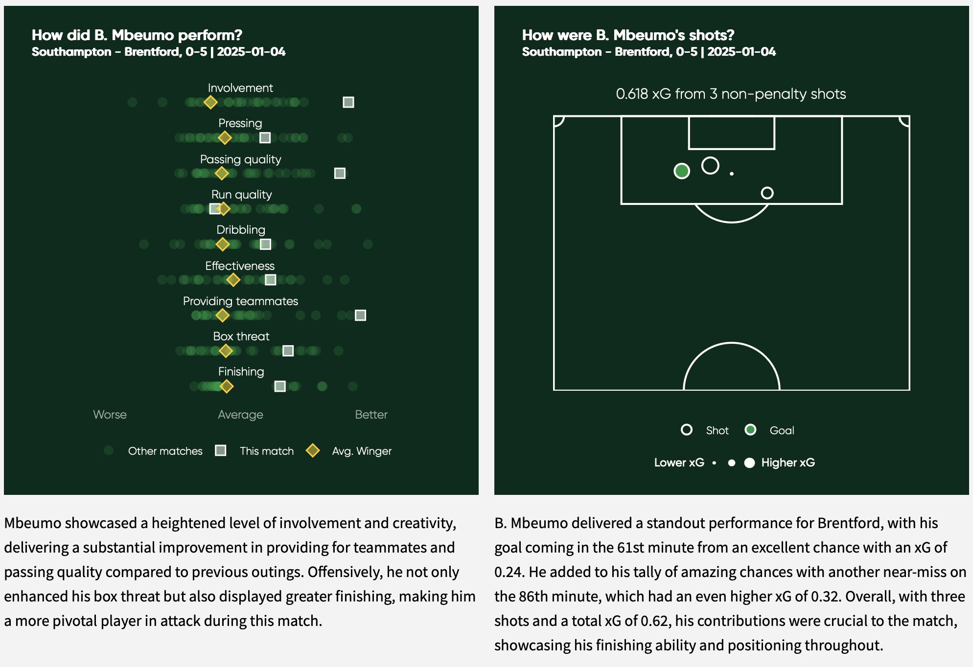Проникают техноголии AI и в футбол. Например есть модель TwelveGPT, которая дообучена на футбольных данных и может создавать отчёты об играх, как на картинке ниже.
