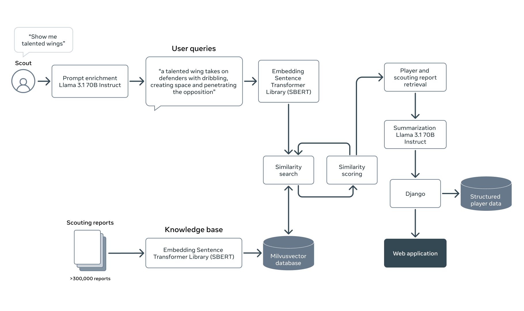 Несколько месяцев назад на сайте одной экстремистской организации выложили кейс использования их LLM модели с открытым исходным кодом Llama 3.1-70B-Instruct в скаутской системе ФК Севилья, ScoutAdvisor. Модель позволяет обрабатывать с высокой скоростью большое количество скаутских отчётов, саммаризировать их и обогащать цифровые данные по игрокам мнением скаутов, что помогает сделать всесторонюю оценку игроков.