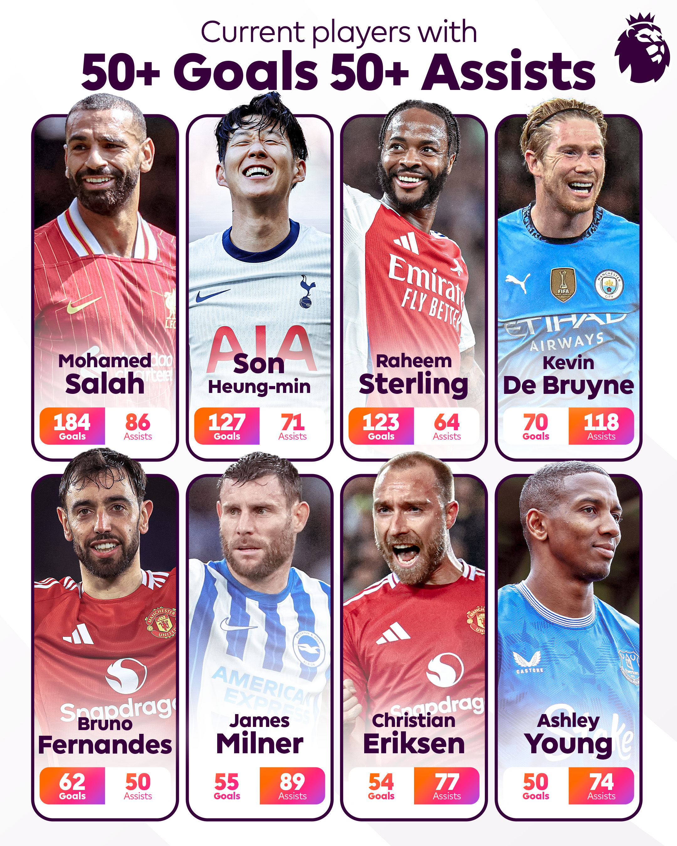 Таких всего восемь: Мо Салах, Сон Хын Мин, Рахим Стерлинг, Кевин де Брюйне, Джеймс Милнер, Кристиан Эриксен, Эшли Янг и теперь Бруну Фернандеш.
