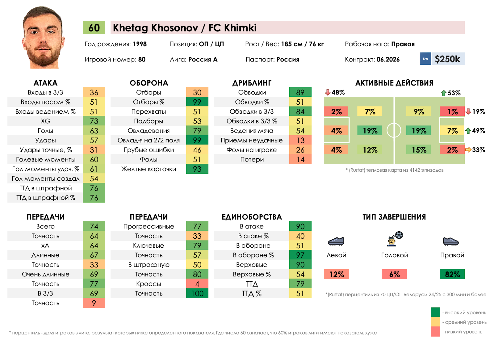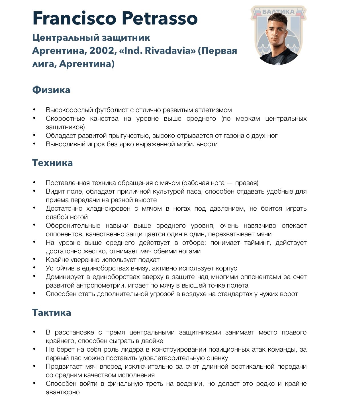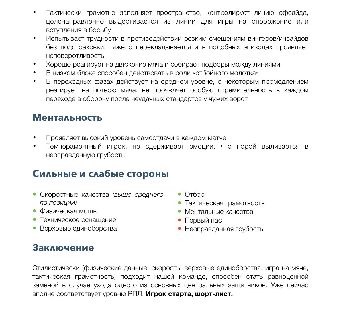 Например, мы пишем отчет-мнение на просматриваемых кандидатов в таких форматах. Это примеры отчета на центрального защитника, который прошел фильтры селекционного отдела, но мы не показывали его тренерскому штабу, так как не было необходимости в усилении данной позиции, и готовили его на случай ухода кого-то из основных центральных защитников команды.