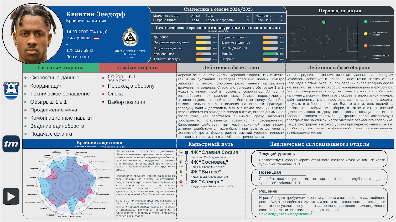 Это 1-ый слайд, где отражается вся необходимая информация по карьере, статистическим данным, игровым качествам, их описание и заключение селекционного отдела по кандидату.