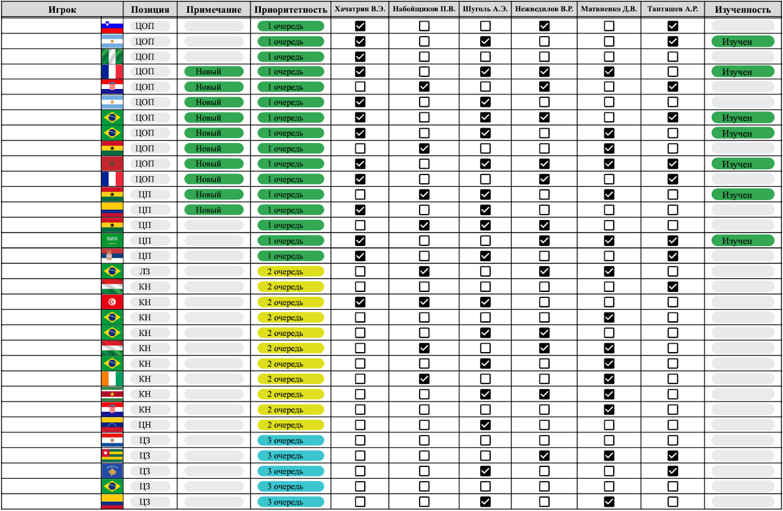 Там же каждый скаут найдет актуальный список игроков, который необходимо просмотреть и изучить в ближайшее время. Игроки выставляются шеф-скаутом по приоритетности (1-ая очередь - приоритетный просмотр, 2-ая очередь - менее приоритетные к просмотру игроки и 3-ая очередь - на текущий момент неприоритетные к просмотру игроки). Приоритет может меняться в зависимости от текущей ситуации в клубе (позиции требуемые для усиления, смена брифа от тренерского штаба и т.д.).
