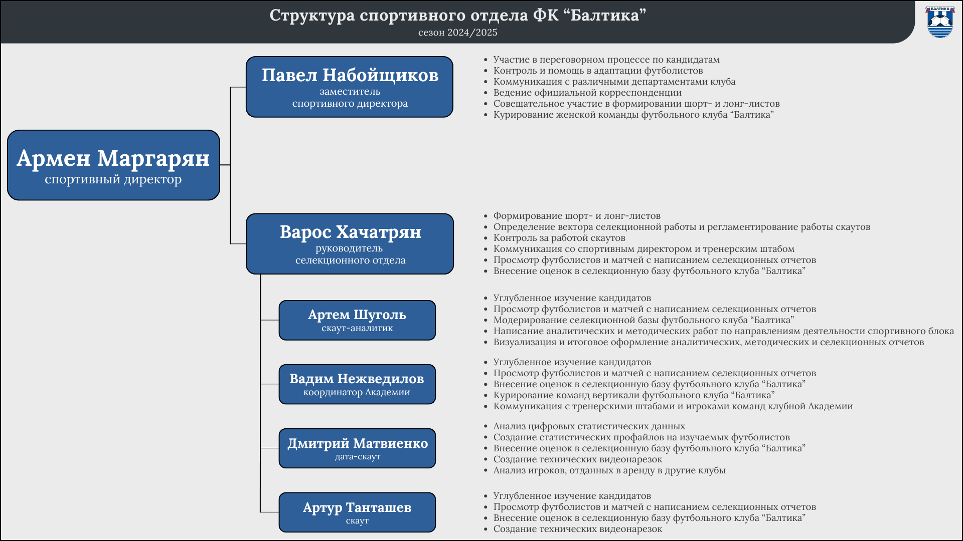 За административно-координационный департамент отвечают Павел Набойщиков, Вадим Нежведилов и я - куратор отдела. А за селекционный - шеф-скаут Варос Хачатрян, Артем Шуголь, Дмитрий Матвиенко, Артур Танташев. Но Павел и Вадим в то же время остаются скаутами со своей зоной ответственности, и параллельно с координационно-административной работой они выполняют функции полноценных скаутов.