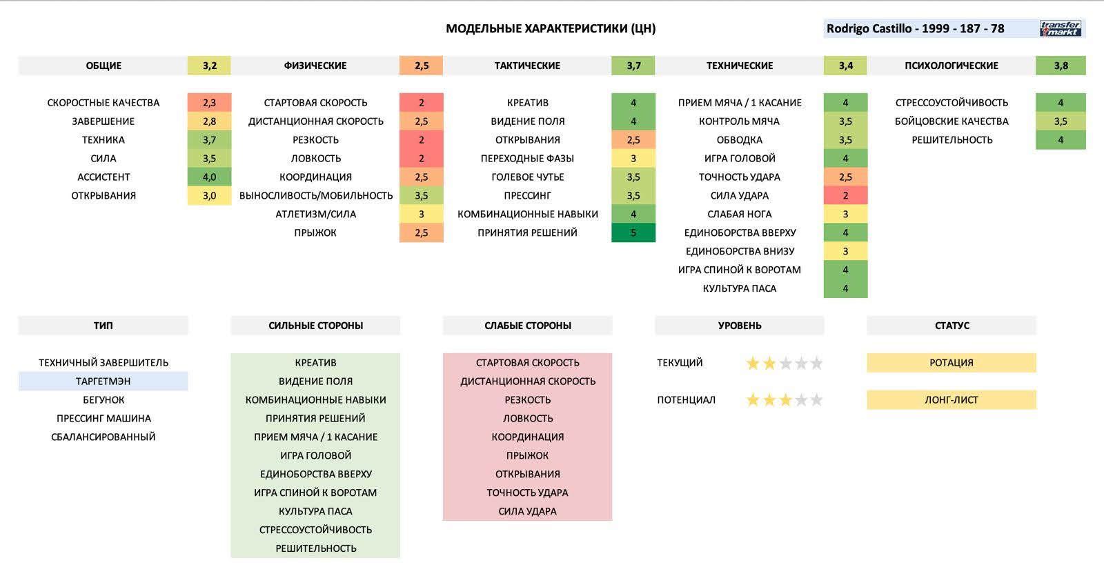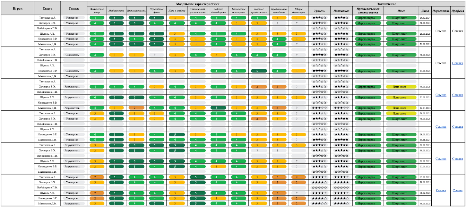 Это часть страницы, где мы каждому рассмотренному игроку проставляем оценки, указываем уровень и потенциал, а также, прогнозируемый статус при переходе в команду. Конкретно здесь представлен фрагмент по опорным полузащитникам. Подобный лист есть на каждую позицию, у каждой позиции - свои модельные характеристики.