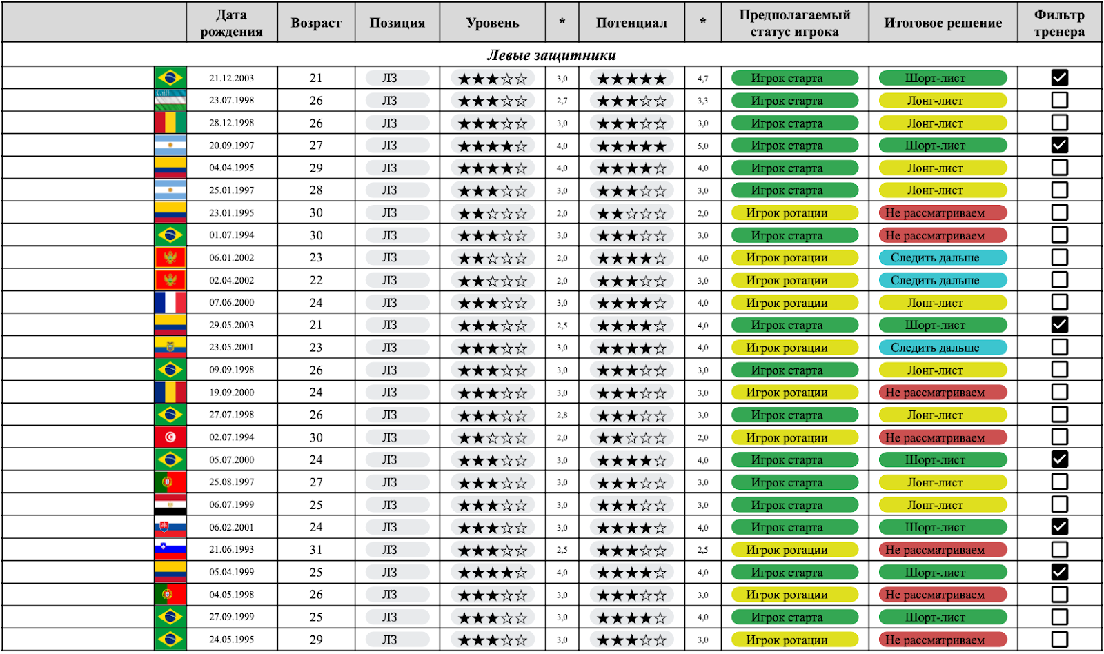 Это фрагмент итогового сводного списка всех изученных игроков по каждой из позиций. Здесь представлена часть списка по левым защитникам.