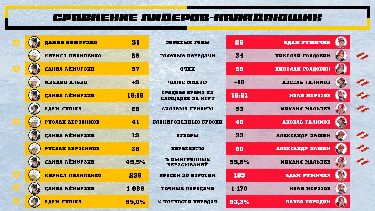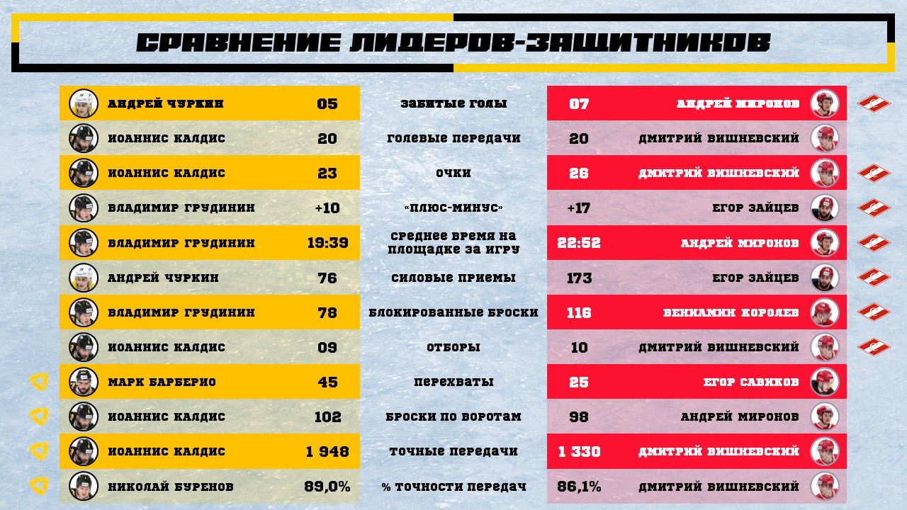 - В сравнении лидеров среди защитников и нападающих по каждому из статистических показателей