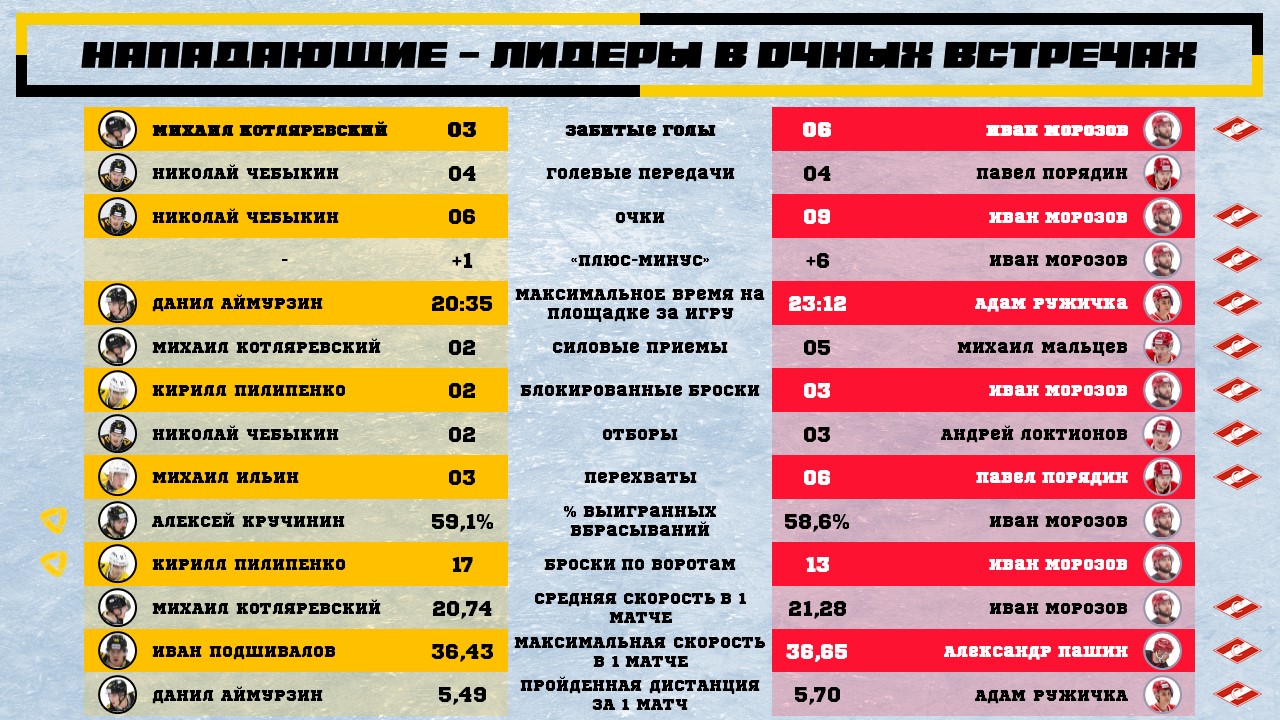 Небольшое пояснение к таблице ниже: у Северстали в показателе «плюс-минус» не указан игрок, так у многих результаты одинаковые и нет смысла выделять кого-то одного.