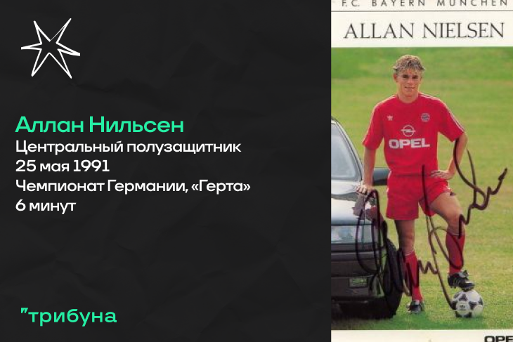 Датчанин Аллан Нильсен, начинавший в родном «Эсбьерге», перешел в «Баварию» в 1989 году. Спустя пару лет он сыграл свой единственный матч за главную команду, преимущественно выступая за вторую. В той же встрече, кстати, дебютировал уже упомянутый Райнер Айгнер, а заменил тогда Аллан своего соотечественника Бриана Лаудрупа. В 1991 году он перешел в швейцарский «Сьон», а затем вернулся в Данию, где и сумел реанимировать карьеру. Хорошие сезоны в «Оденсе», «Копенгагене» и «Брондбю» послужили причиной перехода в лондонский «Тоттенхэм» за 2.00 миллиона Евро в 1996 году. Со «шпорами» он провел несколько хороших лет, даже добравшись до победы в Кубке Лиги. Затем была игра за «Уотфорд» и «Вулверхэмптон» во втором по силе дивизионе и возвращение в Данию. Нильсен, сыгравший более сорока матчей за национальную сборную, завершил карьеру в 2006 году. Сейчас ему пятьдесят четыре года.