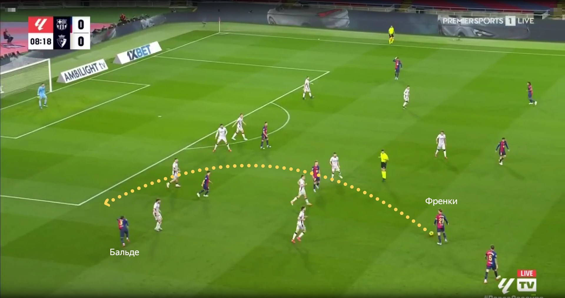 Нередко возникали эпизоды, когда полузащитники «Барсы» забрасывали мяч за спины защитной линии соперника. Здесь Френки нашел передачей Бальде. Подробнее некоторые действия Алекса разобрал в телеграм-канале.