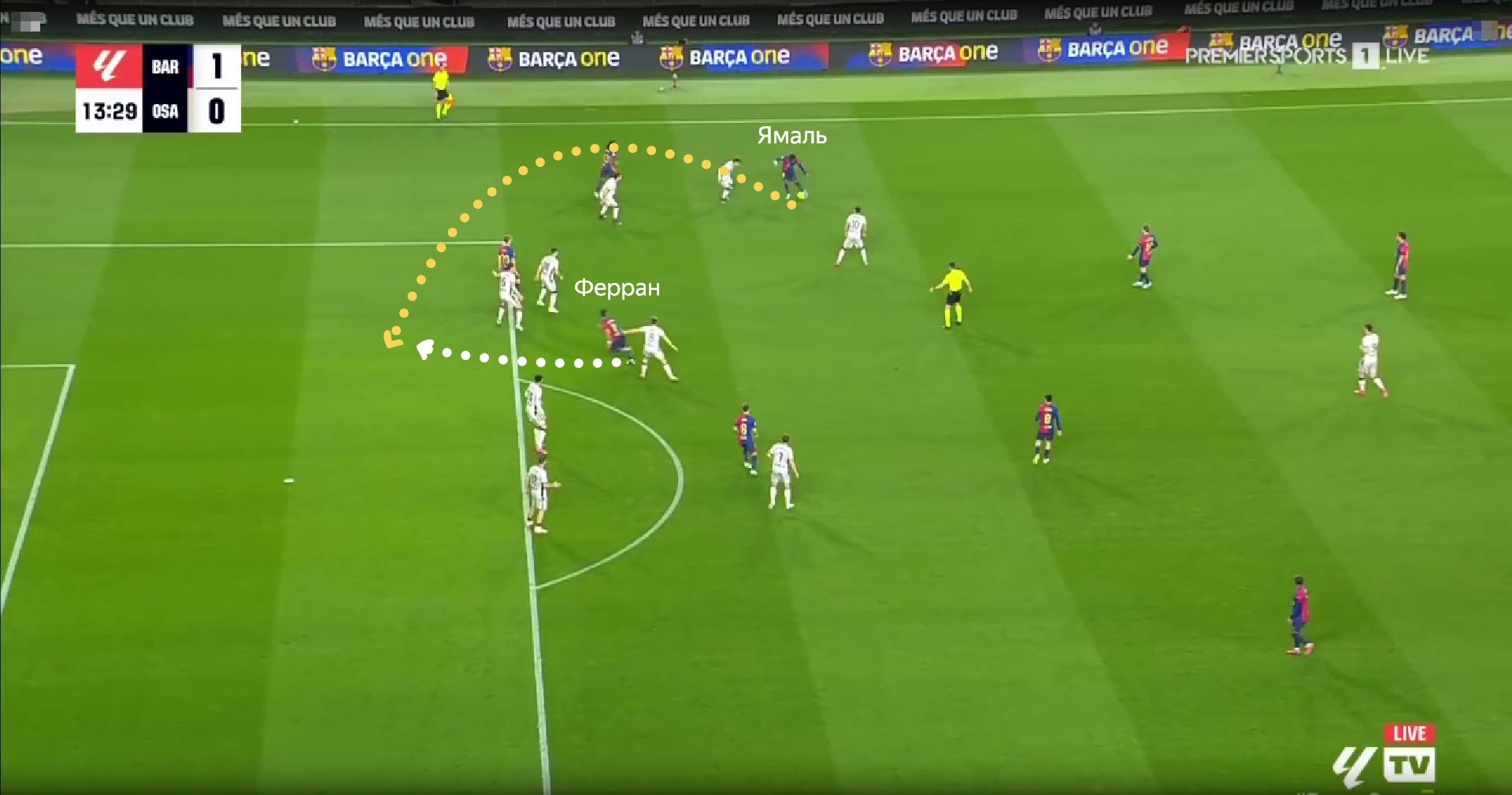 Например, здесь Ферран уходит в глубину для помощи в развитии атаки.