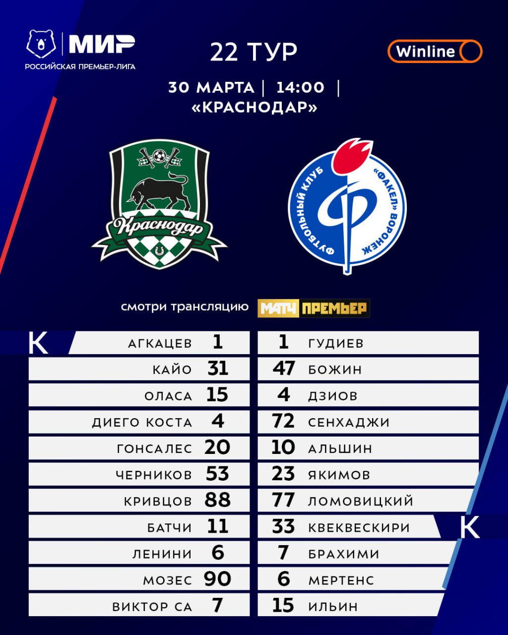 Состав Краснодара довольно легко угадывался. Кордоба пропускал матч из-за дисквалификации. Судя по словам Мурада Мусаева, Тормена ещё не приступил к тренировкам. Но при этом удивило появление Сперцяна в заявке и потом, как выяснится он повлияет на результат матча. Ну а Факел продолжает показывать свою нестабильность состава. Выход Брахими добавил атакующий потенциал воронежцам, но это не спасло их.