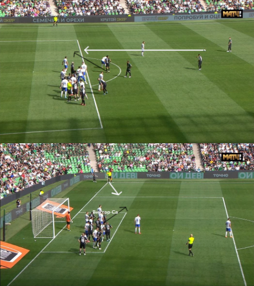 Помимо структуры игры гостей, могу отметить необычные розыгрыши стандартов у хозяев. В первом случае, как видно, Оласа вместо классического навеса решил покатить на Ленини, который забегал на фланг. Во втором случае, Оласа также покатил низом на Виктоа Са, который неожиданно выбежал для защитников Факел. В остальном тайм ничем примечательным не запомнился.