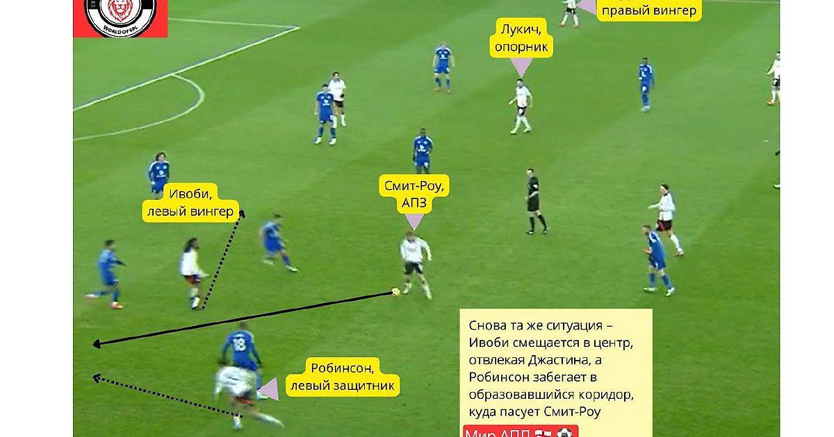 Антони Робинсон растягивает оборону Лестера. По нему работает уже не правый защитник «лис», а правый полузащитник. Но все равно Ивоби своим рывком по направлению к своему левому защитнику привлекает внимание Джастина и даже опорника противников Уинкса. Видя свободного Эмила Смит-Роу,Антони сразу же награждает его передачей. Правый вингер Харри Уилсон, который до этого все время играл сугубо по позиции, справа на фланге, в этот раз смещается в центр и разыгрывает мяч с «десяткой». В атаку пришел и центральный защитник Бэсси, поэтому опорники не подключились к этому нападению, а остались в защите.