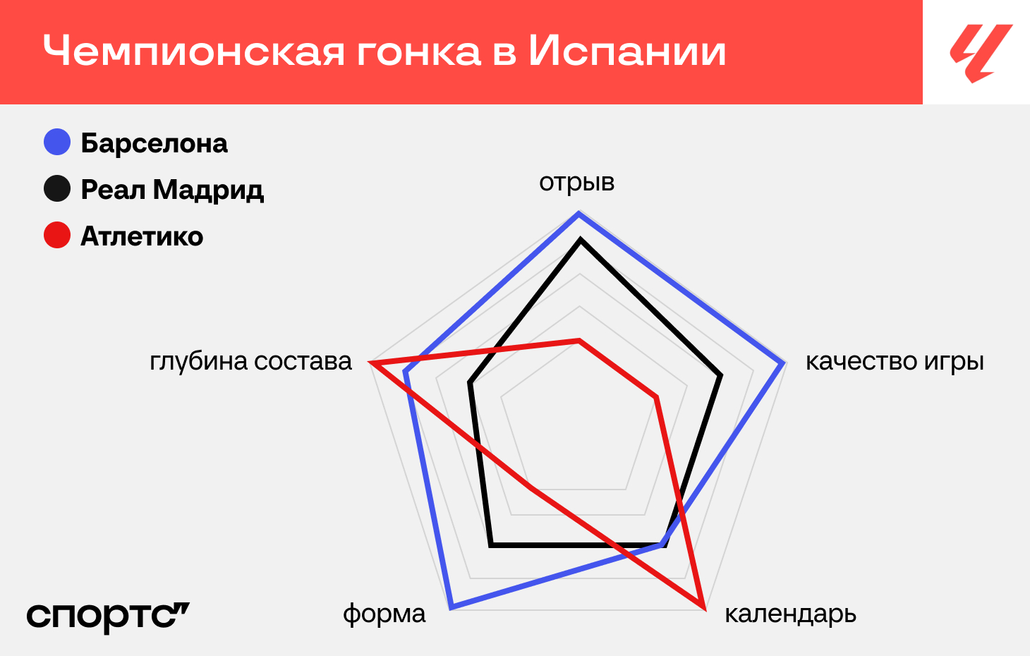 Прямо сейчас у «Барсы» по два-три хороших варианта почти на все позиции – это главное преимущество перед «Реалом» в чемпионской гонке. «Атлетико» не уступает каталонцам в этом аспекте, но им надо отыгрывать отрыв. При равном количестве очков именно команда Диего Симеоне выглядела бы главным соперником «Барсы» на длинной дистанции.