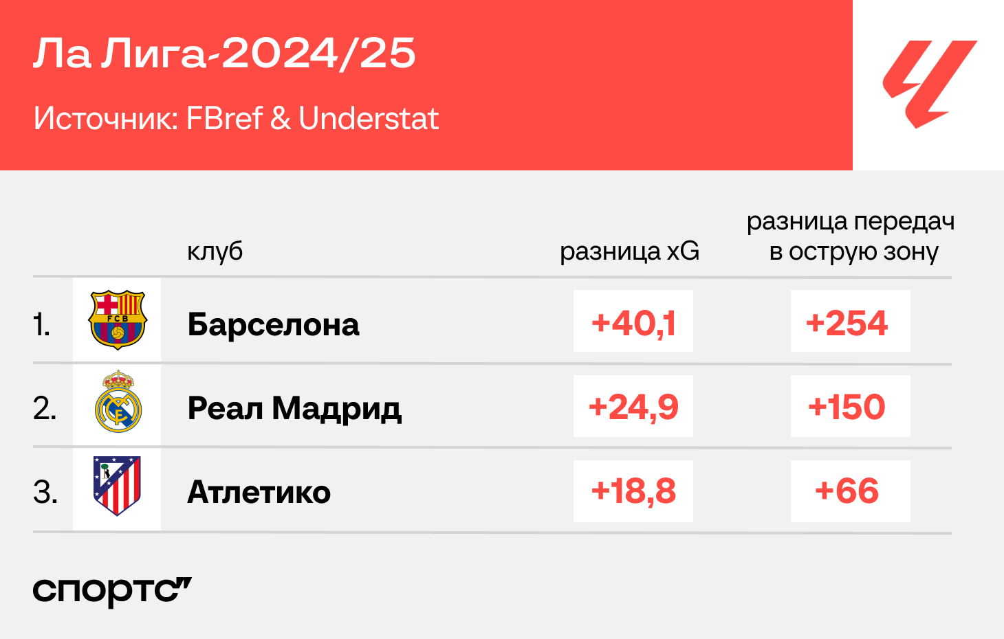 Эти данные не меняют картину, а лишь дополняют ее. При таких значимых расхождения команды можно весьма четко ранжировать по качеству футбола. «Барселона» – лидер. За ней «Реал». На третьем – «Атлетико». Качество игры – слегка размытое понятие и в более пограничных случаях споры были бы уместны, но тут команды совсем уж явно рассчитались на первую, вторую, третью.