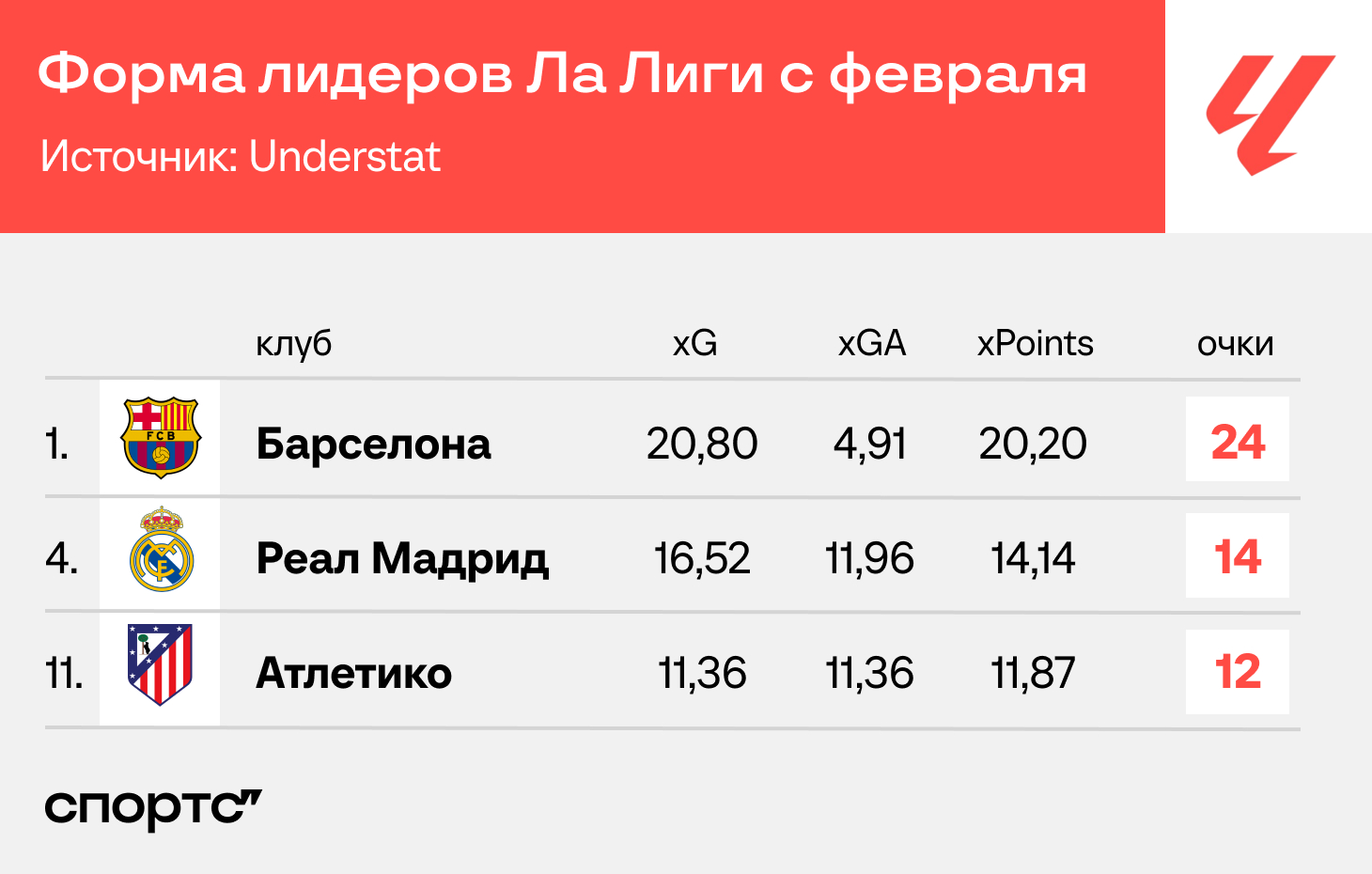 «Барса» в этой таблице чувствует себя даже комфортнее, чем в обычной. «Атлетико» ближе к «Вильярреалу» и «Атлетику», чем к топ-2. Волшебные замены Диего Симеоне долго держали их в гонке, но по поставленности игры они значительно уступают «Барсе» и «Реалу».