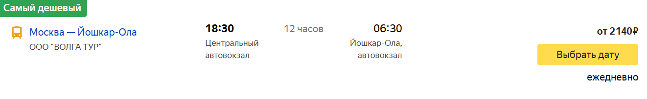 Наиболее популярный рейс отправляется в 18:30. Стоимость билетов самая низкая – от 2 140 рублей. Во всех остальных случаях билет стоит 2 354 рубля. Все автобусы, кроме рейса в 08:30, прибывают на городской автовокзал Йошкар-Олы. Время в пути составляет 12 часов за исключением ежедневного рейса на 17:00, автобус едет 13 с половиной часов. На городской автовокзал прибывают автобусы следующих прямых и проходящих маршрутов: