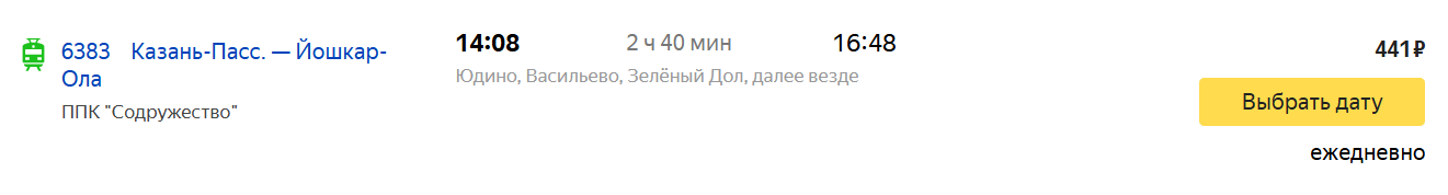 Ежедневно из столицы Татарстана в Йошкар-Олу отправляется электричка сообщением №6383. Время в пути занимает два часа сорок минут, стоимость проезда 441 рубль. По пятницам, субботам, воскресеньям ходит дополнительная электричка №6365, она отправляется в 06:46, время в пути составляет чуть больше трех часов. Если едете в Йошкар-Олу через Казань, обязательно обратите внимание на время прибытия поезда. Приехав во второй половине дня придется ждать электричку сутки или пользоваться альтернативными транспортными средствами. До железнодорожного вокзала можно доехать следующими видами общественного транспорта: