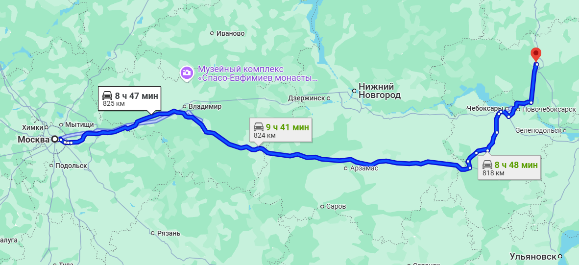 Обе дороги ведут по направлению к Владимиру, но в сам город заезжать не следует. На кольцевом участке после Колокши нужно уйти правее и продолжить движение в сторону Мурома. Далее трасса пролегает через населенные пункты Нижегородской области. На развязке возле Подборного и Дубовки нужно сделать разворот налево на север и продолжать движение в сторону Чебоксар. Здесь два маршрута: короткий через город и в объезд с юга. Город это практически всегда пробки и светофоры, отслеживайте дорожную обстановку. После Чебоксар пересекаете Волгу по мосту и продолжаете движение по трассе Р176 «Вятка». В районе села Пучины нужно сделать последний поворот налево на север и до Йошкар-Олы останется заключительный участок пути.