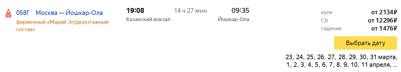 Расписание очень удобное. Поезд отправляется из Москвы вечером, утром прибывает в Йошкар-Олу. Дорога занимает 14,5 часов. Стоимость билетов начинается от 1 476 рублей за сидячие места, от 2 134 рубля в плацкартный вагон, от 12 296 купе.