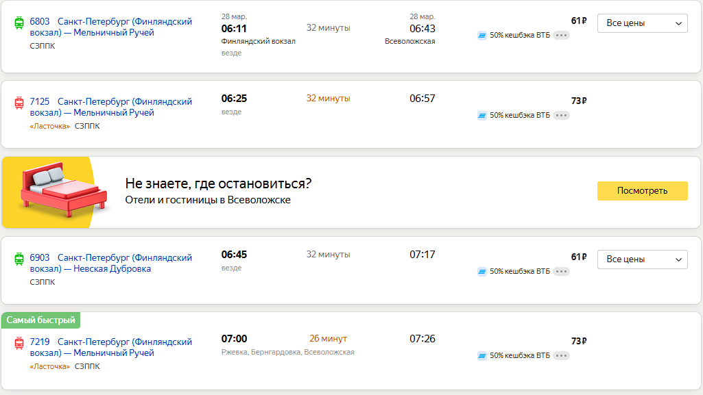 Самым удобным вариантом по соотношению «цена-качество» остается поездка на экспрессах «Ласточка». Огромный минус в том, что мало рейсов. Обычные электропоезда и автобусы отправляются во Всеволожск чаще, но уйдет больше времени на дорогу, и они менее комфортны.