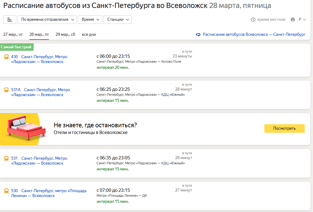- №531 «Санкт-Петербург – Всеволожск», отправление с 06:35 до 23:05, интервал движения каждые 15 минут, конечная КДЦ «Южный»;
