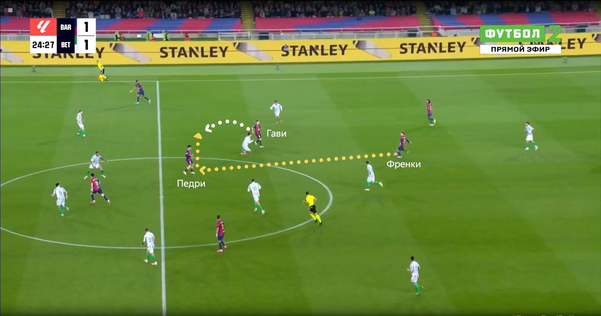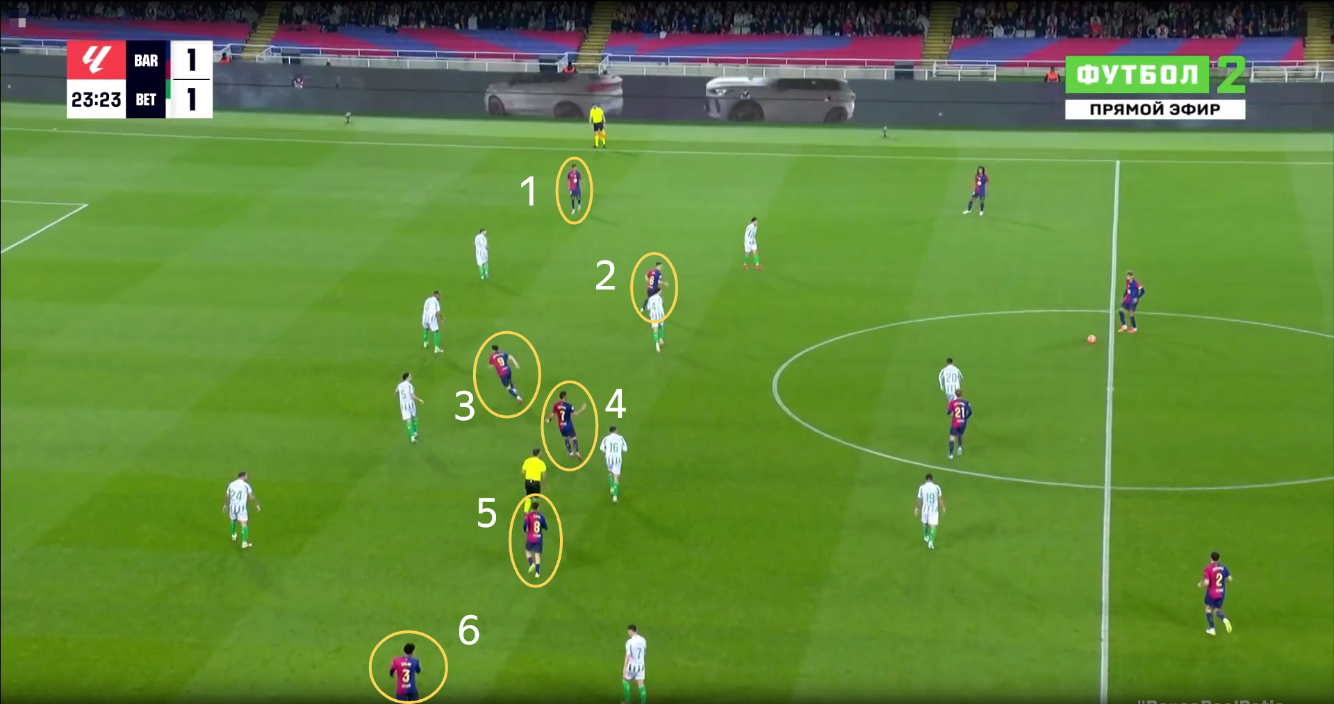 В эпизоде с забитым мячом каталонцев также действовал схожий принцип: комбинация перед штрафной и вывод свободного игрока на ударную позицию.